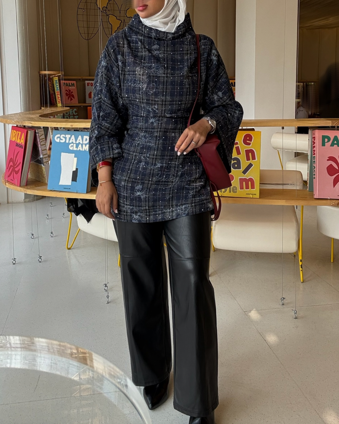 This top combines structured simplicity with subtle detailing. The rich grid pattern adds depth and sophistication, while the high neckline gives it a confident, elevated look. Comfortable, stylish, and perfect for winter outings, casual dinners, and chic daytime plans.